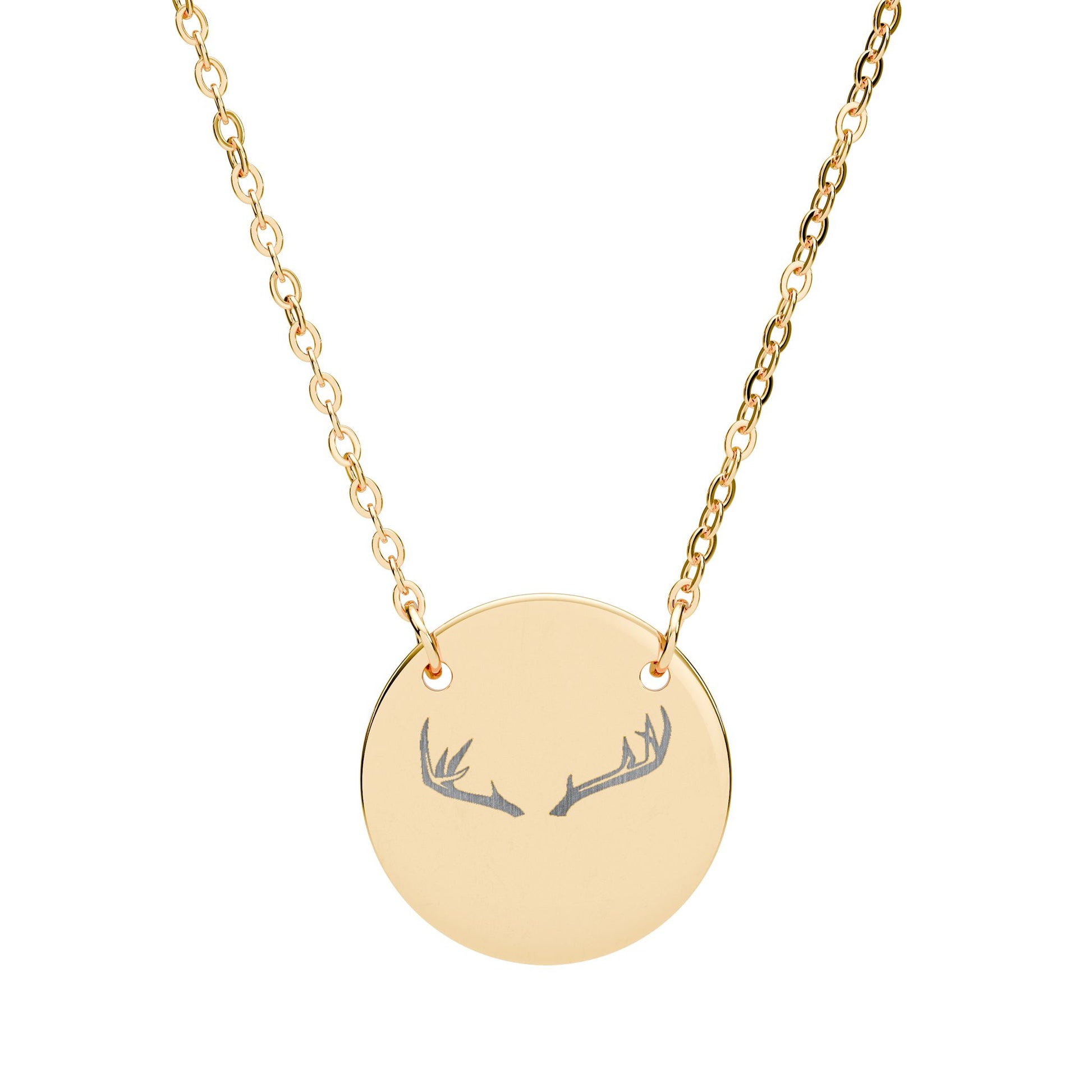 This minimalist pendant features a compact 18 x 18 mm round disc engraved with a subtle antler motif, designed to sit close to the collarbone for an easy, everyday look. Crafted from 316L surgical-grade stainless steel and finished with a durable PVD coating, it keeps a soft shine while standing up to daily wear. The antler artwork is laser-etched for a crisp, permanent detail that won’t fade, peel, or rub away. Lightweight, hypoallergenic, and effortlessly layerable, it’s the kind of piece you can wear as a personal reminder—modern, clean, and gently rustic.